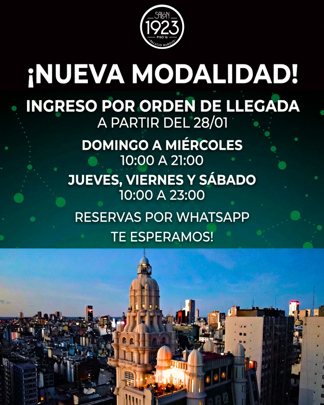 Nuestro rooftop fue inaugurado en el 2019 y, casualmente ese año, se cumplía un siglo de emplazar la piedra fundacional del edificio (en 1919) SALÓN1923 completa el sueño de sus creadores (el Arq Mario Palanti y el empresario Luis Barolo) que proyectaron instalar un bar en su azotea. Es por eso que el nombre del rooftop homenajea sus orígenes: la palabra AZOTEA y SALÓN figuraba en los planos originales del edificio y el número 1923 remite al año en que se inauguró el Barolo. (el Palacio tardó cuatro años en edificarse)